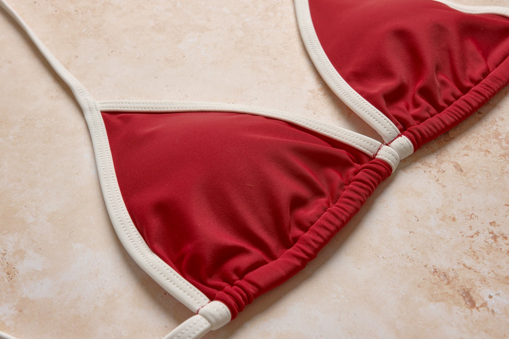 Turn up the fun with the Coco Rojo Bikini Top, featuring a vibrant red shade highlighted by crisp white lines. This playful design adds a fresh, energetic vibe to your swimwear, perfect for making waves and brightening beach days!