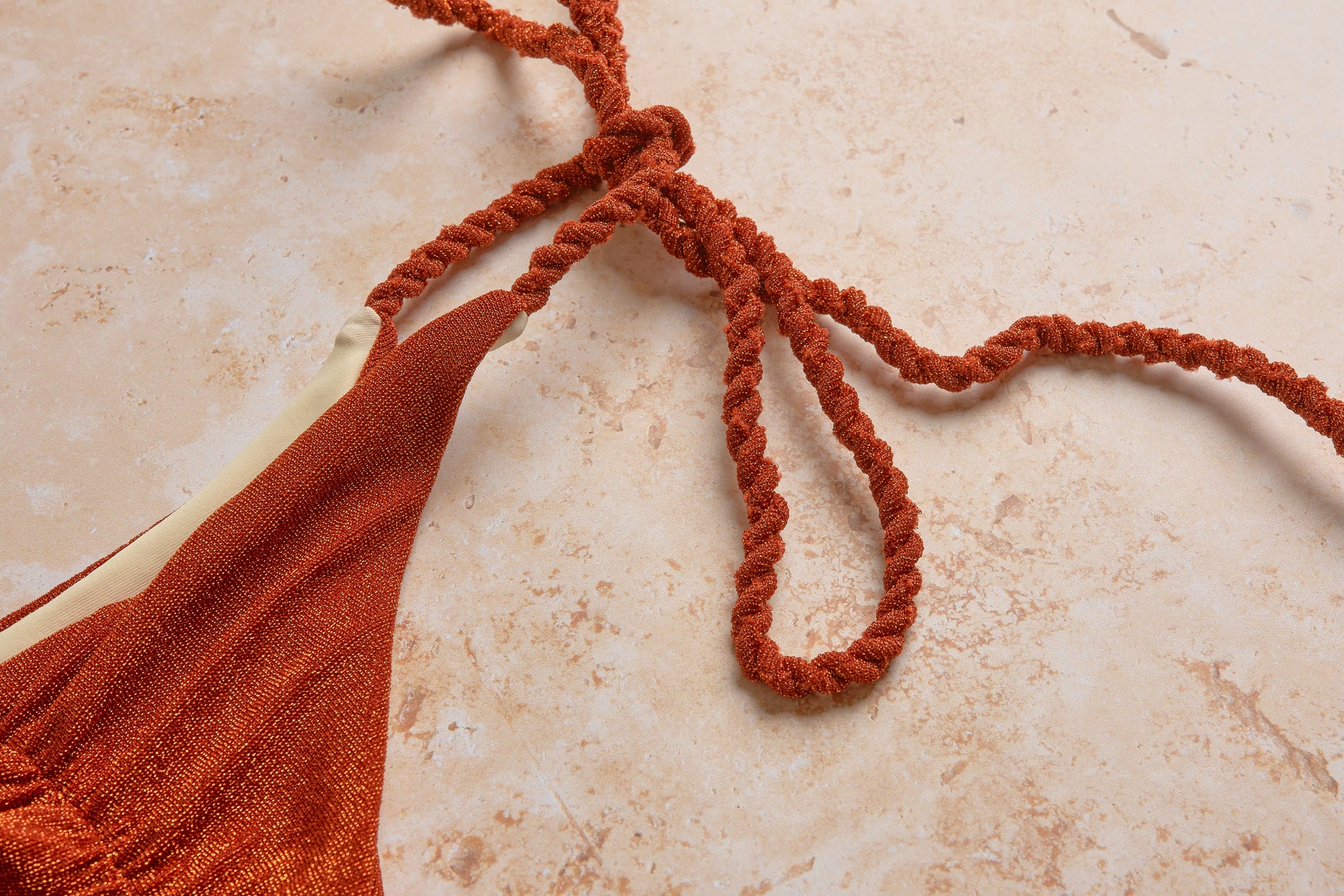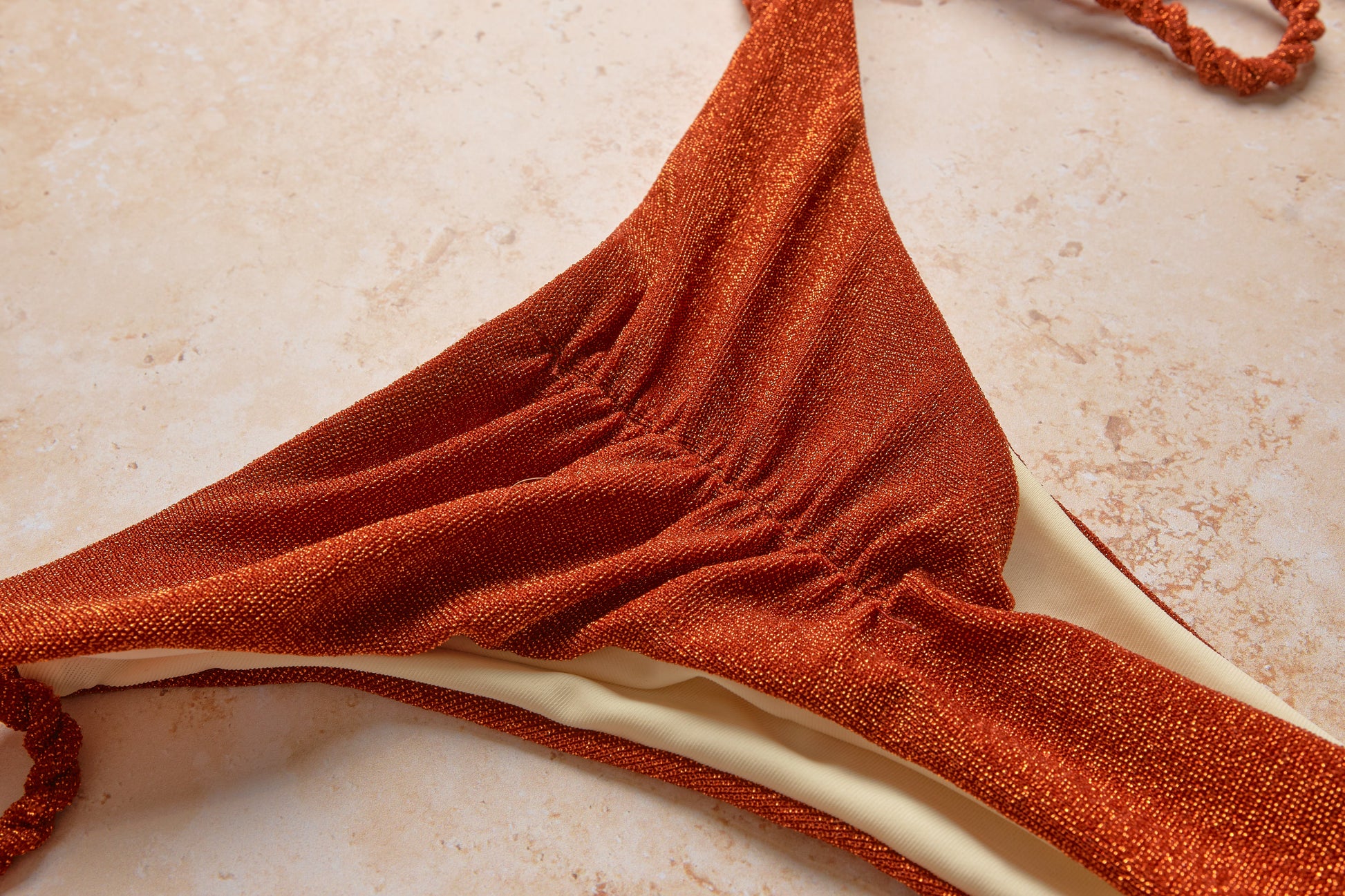Lights on. Center stage. Life of a Showgirl is all about sparkling confidence and main-character energy. A shimmering rust fabric, braided straps, and our signature Brazilian ruffled bottom create a bold silhouette worthy of a spotlight.